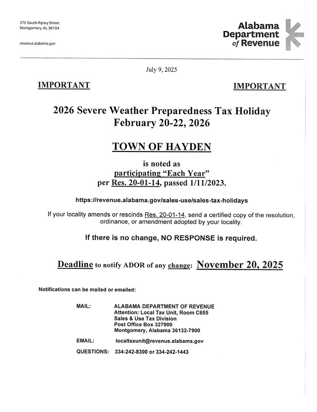 PUBLIC NOTICES Posted on May 9, 2025 by admin March 2026 Council Meeting Tuesday, March 10, 2025 Work Session 6pm Council Meeting 7pm Rebuild Alabama Act – Resolution 2025-08-12 Resolution 2025-08-12 Rebuild Alabama ActDownload